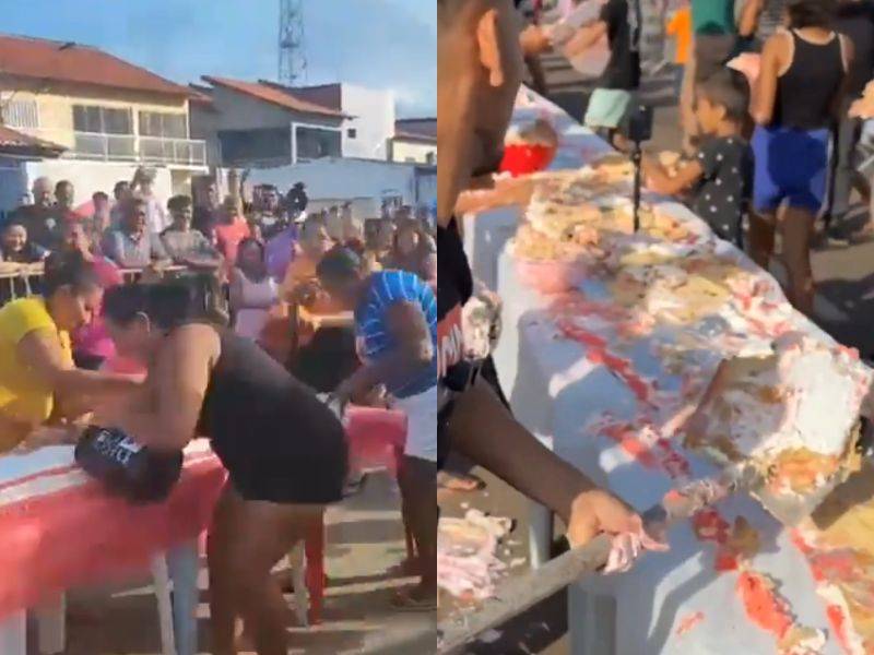 Nas imagens, é possível ver dezenas de pessoas se aglomerando com sacolas, baldes, bacias — e até uma pá — na tentativa de garantir um pedaço do bolo. Um homem, em especial, chamou atenção ao aparecer usando uma pá e um balde para recolher a sobremesa, em meio ao empurra-empurra.