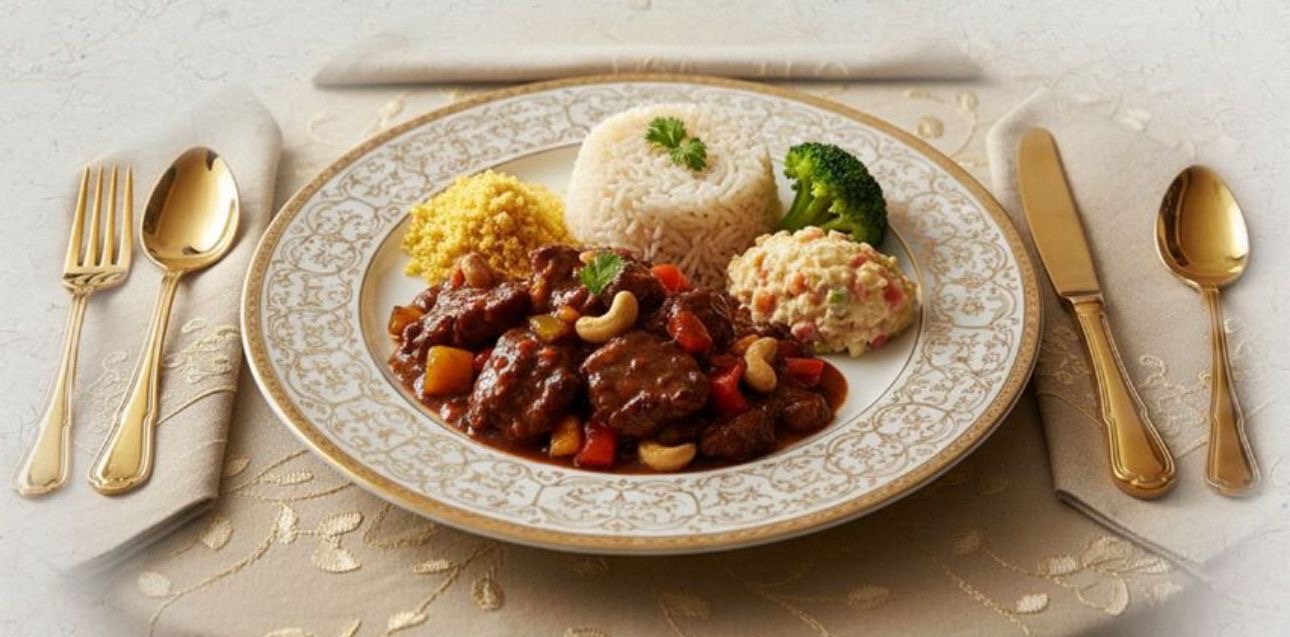 Carne ao molho xadrez, arroz refogado, farofa, verdura e sobremesa (bombom) — um verdadeiro convite ao paladar e à convivência em comunidade.