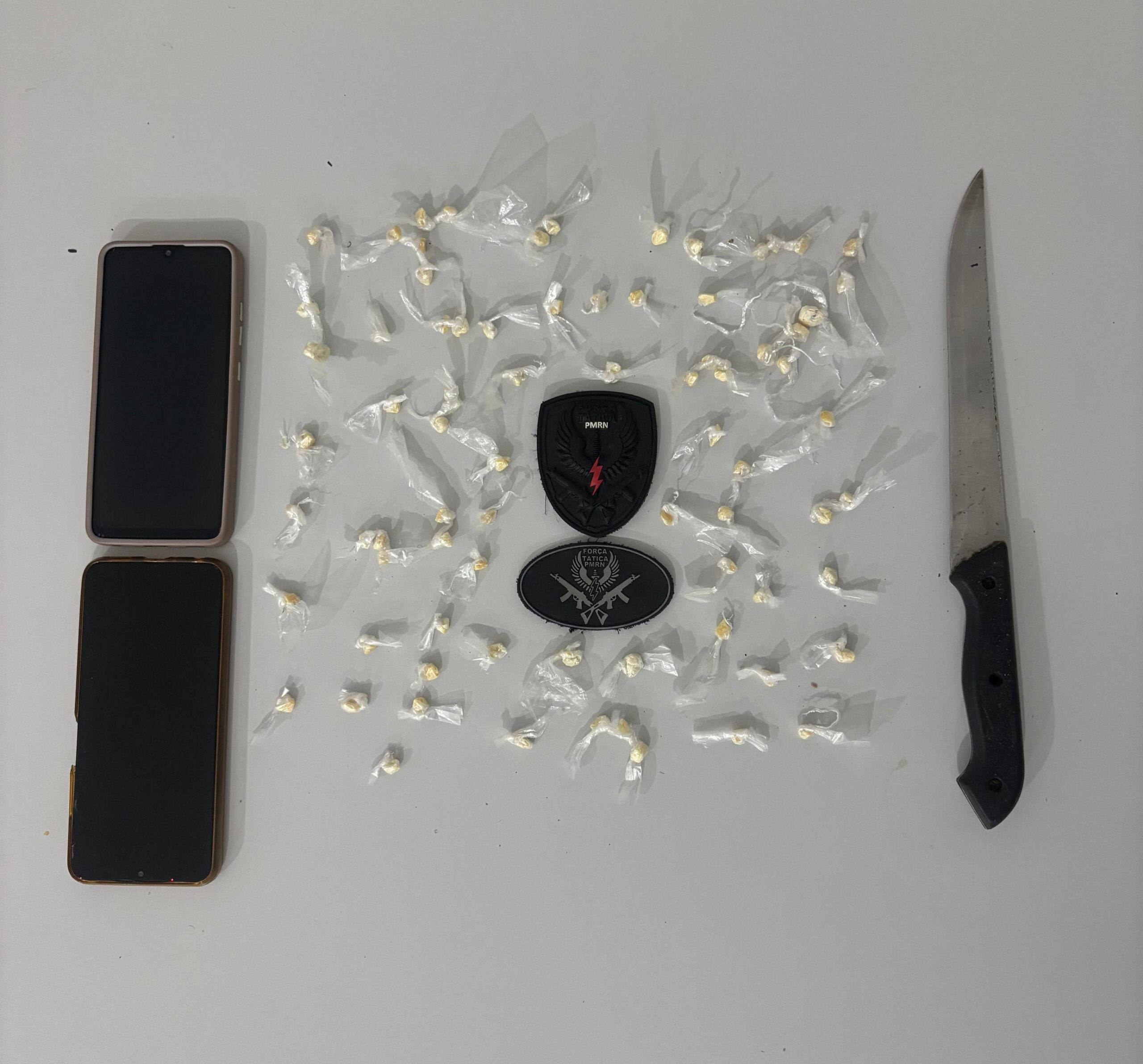 Nas buscas realizadas no local, os policiais apreenderam uma mochila contendo 77 pedras de substância análoga ao crack, uma faca e três aparelhos celulares. Os suspeitos foram conduzidos, junto com o material, à Delegacia de Plantão em Parnamirim, onde foram autuados em flagrante e ficaram à disposição da Justiça.